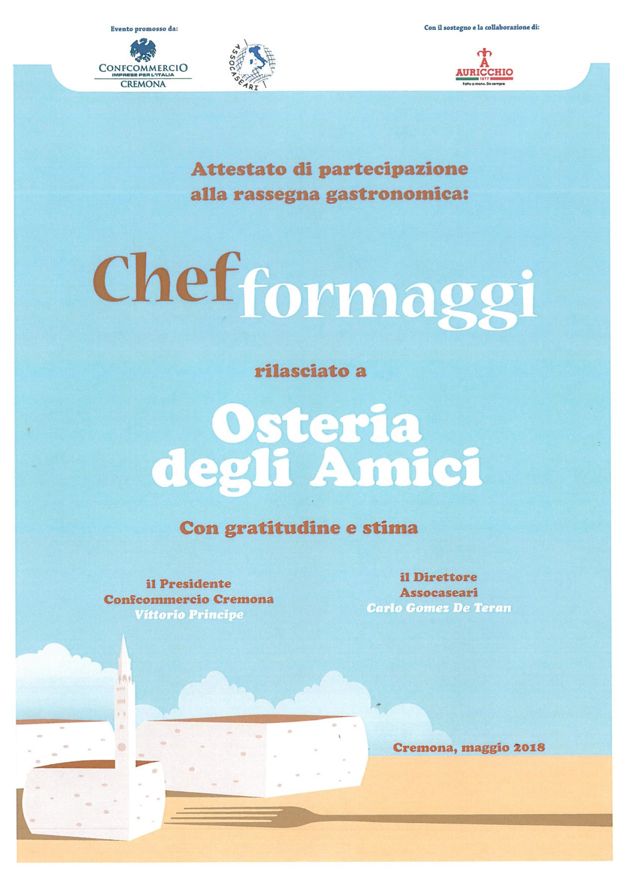 Chef Formaggi maggio 2018 - Attestato di partecipazione alla rassegna gastronomica "Chef Formaggi"