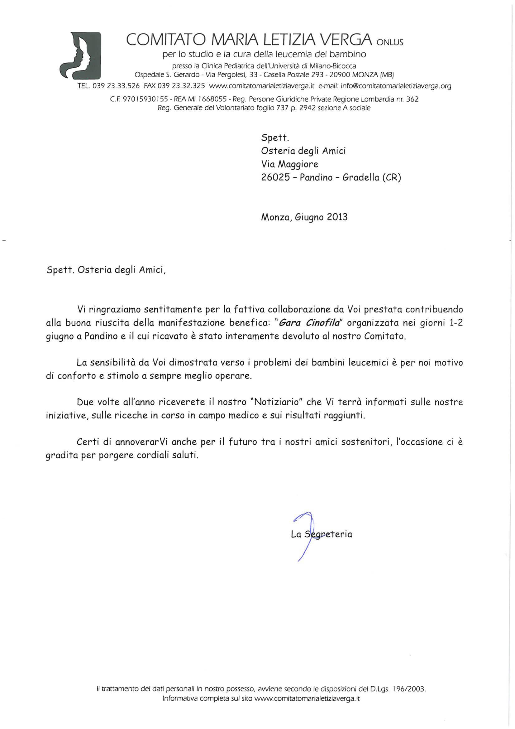 Comitato Maria Letizia Verga giugno 2013 - Ringraziamenti per la collaborazione alla "Gara Cinofila" di Pandino